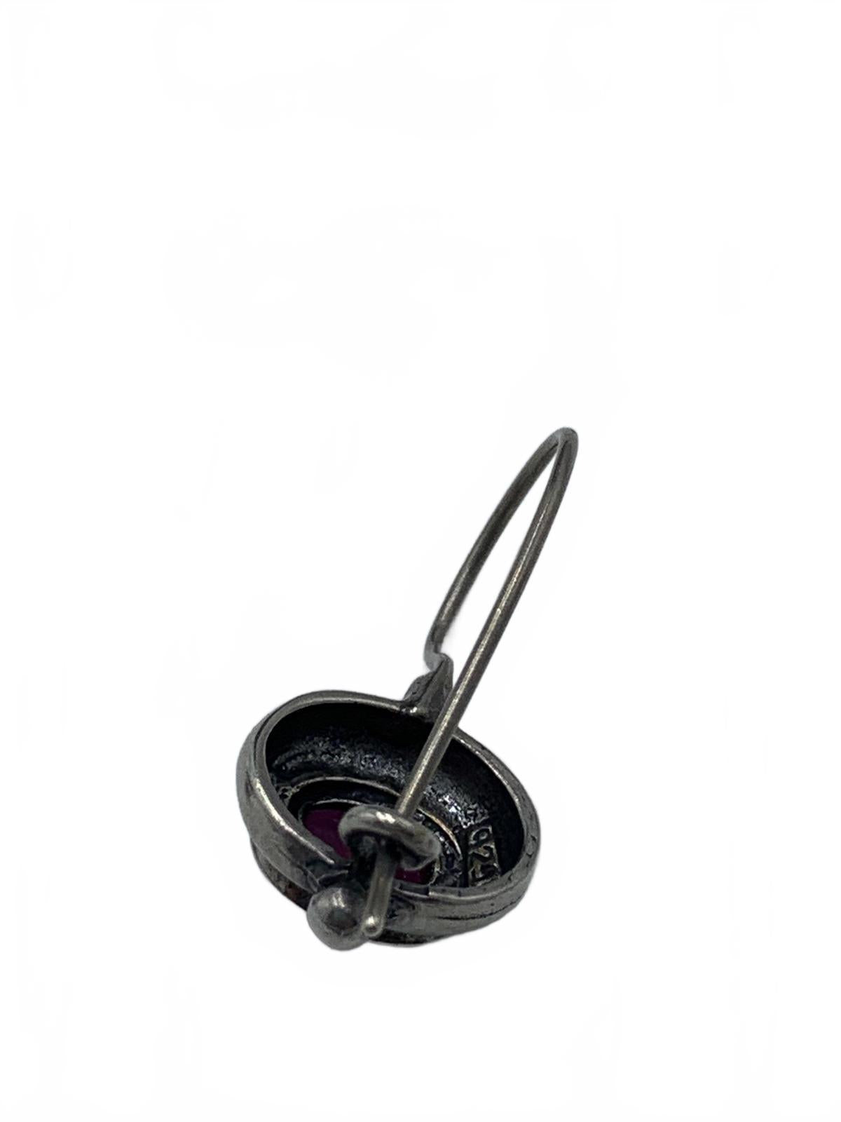 Luminous red bezel-set Garnet Cabuchons make these earrings the quintessence of simplicity and classic style. Crafted in Sterling Silver, with long hooks for an attractive dangle, then include the practicality of safety hooks to locks shut and prevent loss.