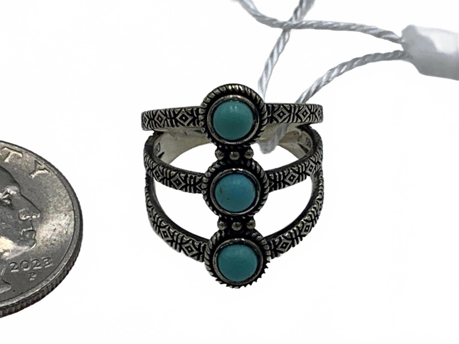 With three blue Turquoise Cabuchons and extensive Southwester native-inspired engraving, this ring will work well with a Bohemian vibe and relaxed personal style.