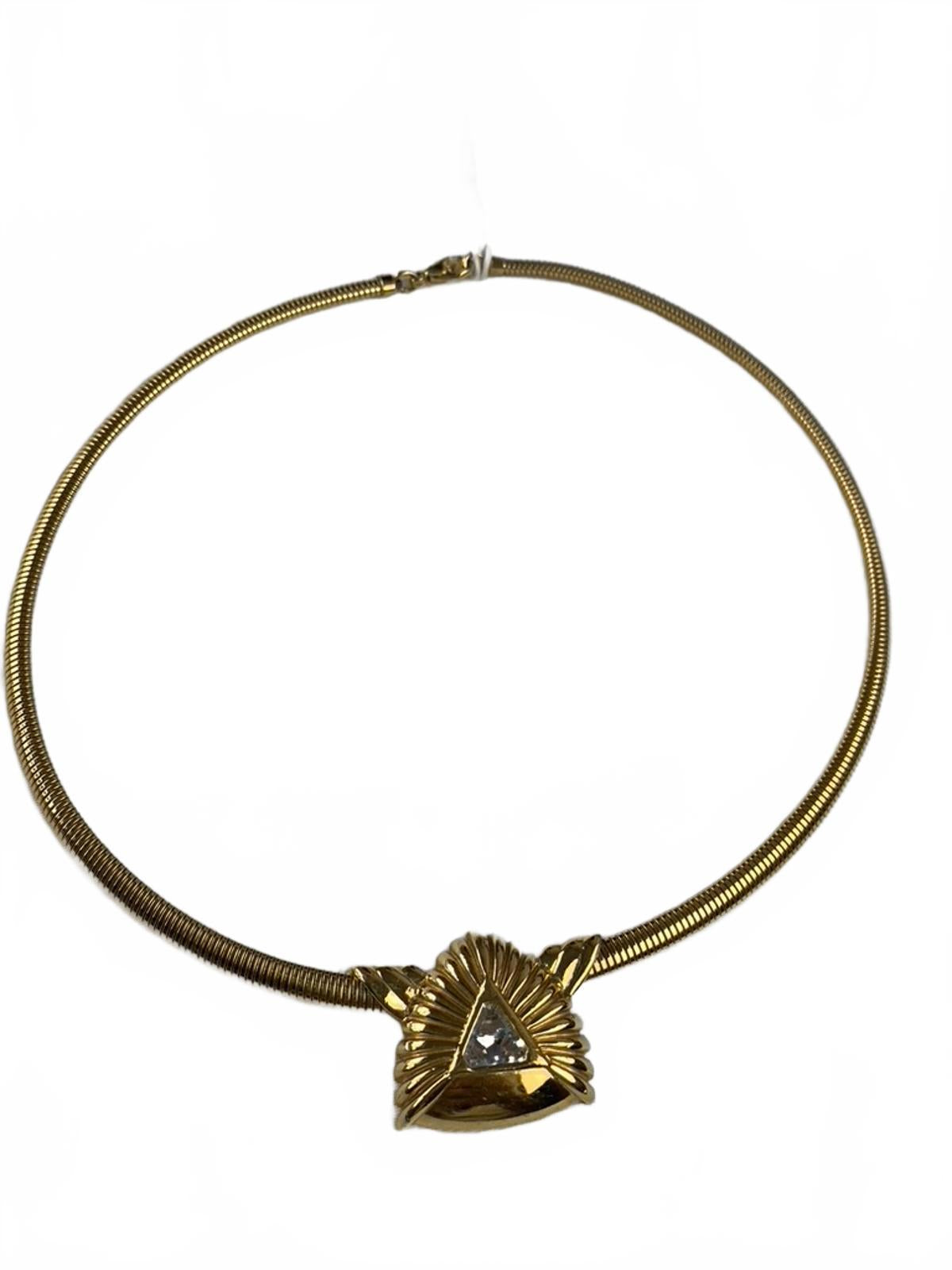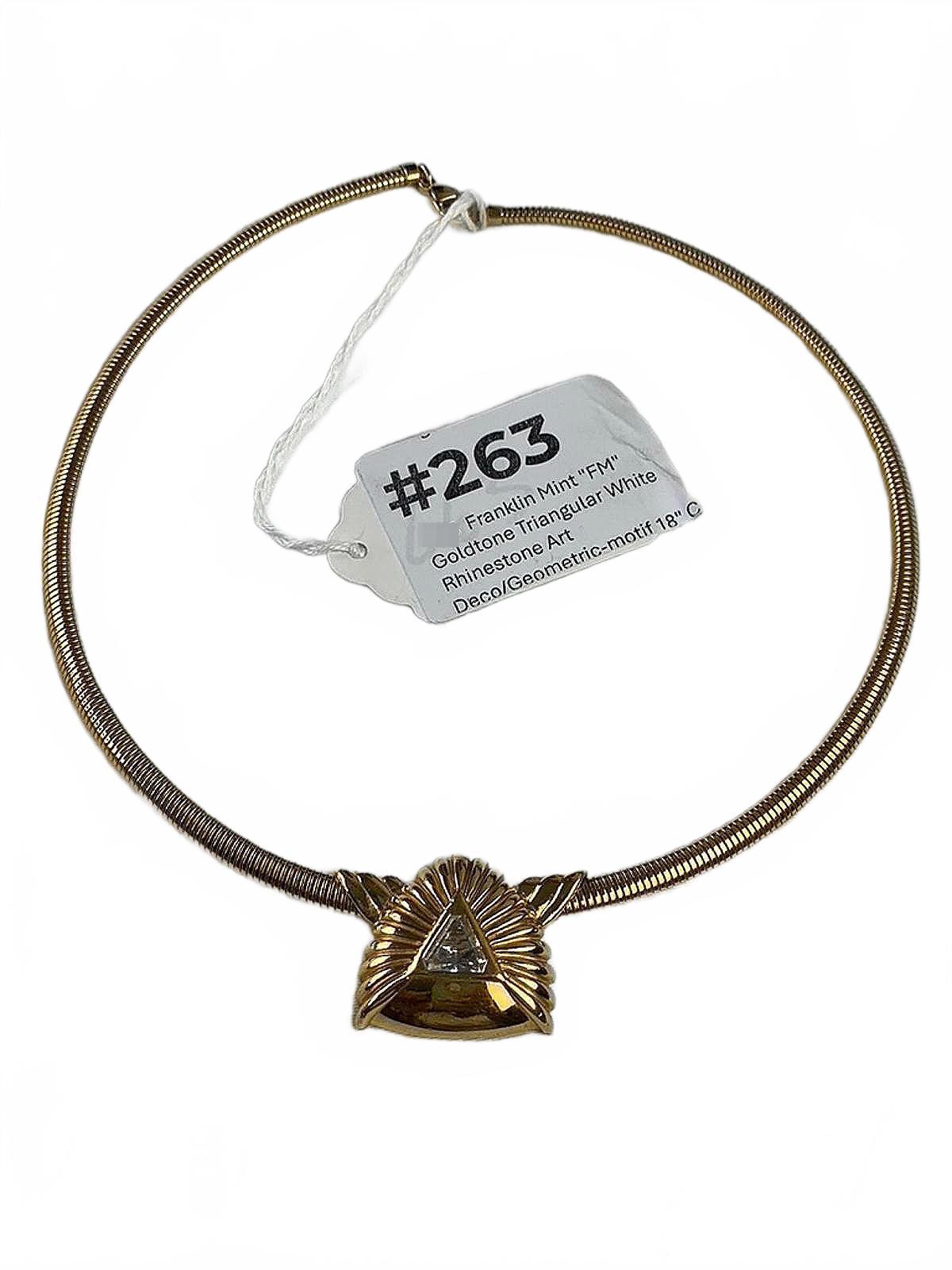 Franklin Mint "FM" Goldtone Triangular White Rhinestone Art Deco/Geometric Costume Necklace/Pendant size 18"