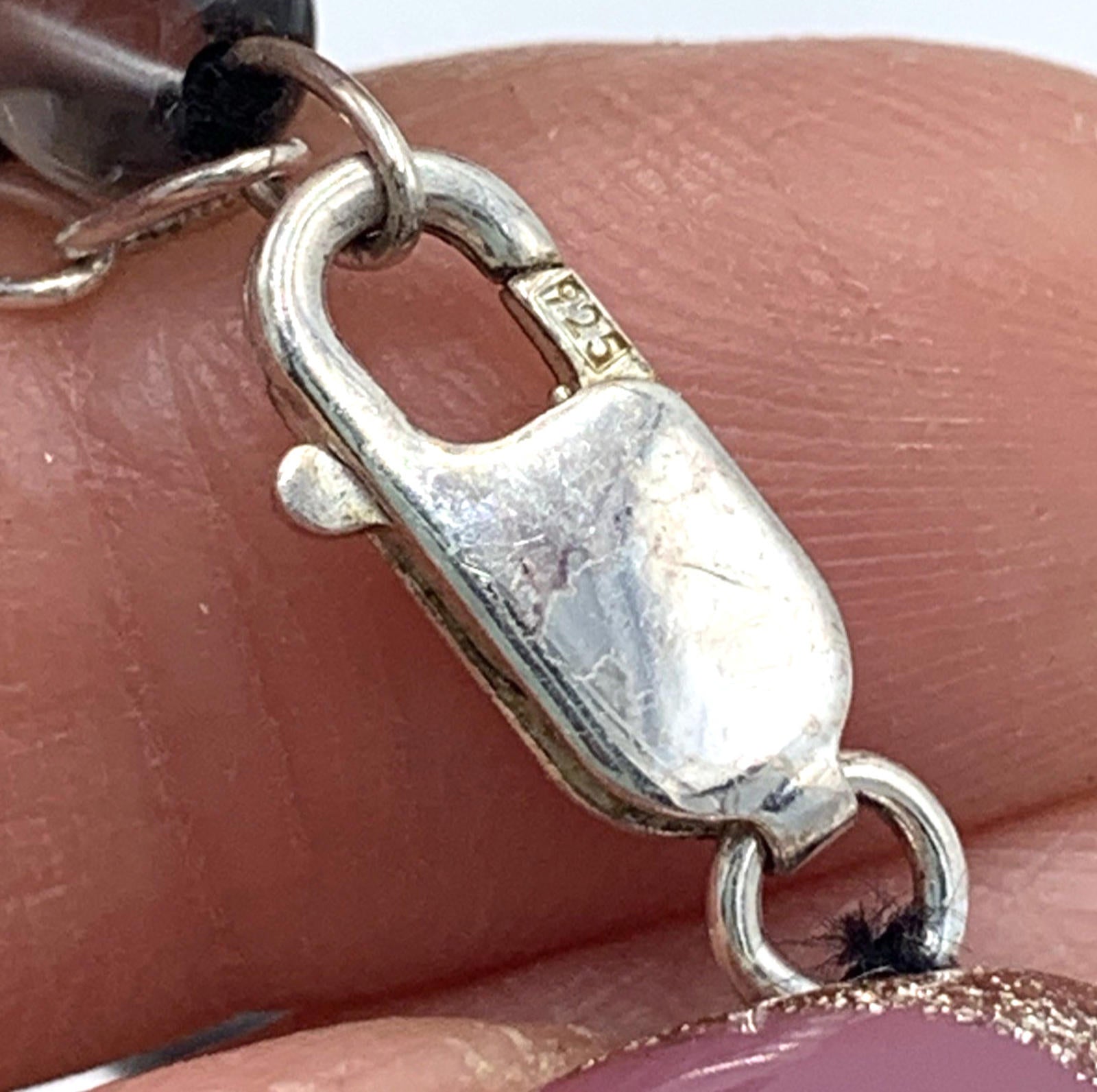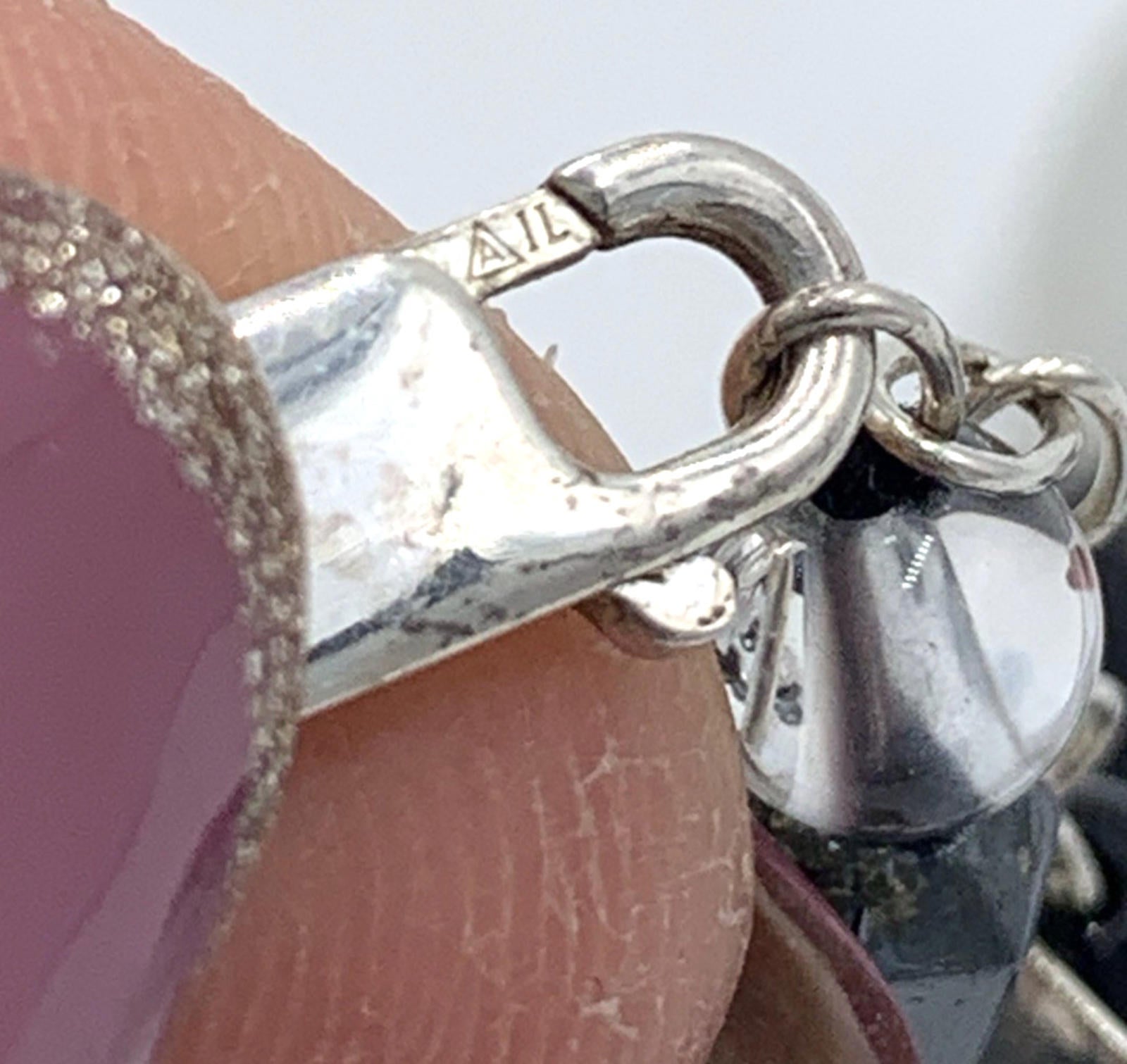 Pictures don’t do this necklace justice. Excellent used condition, high polish, some patina on sterling silver clasp and hang tag. Length 30".