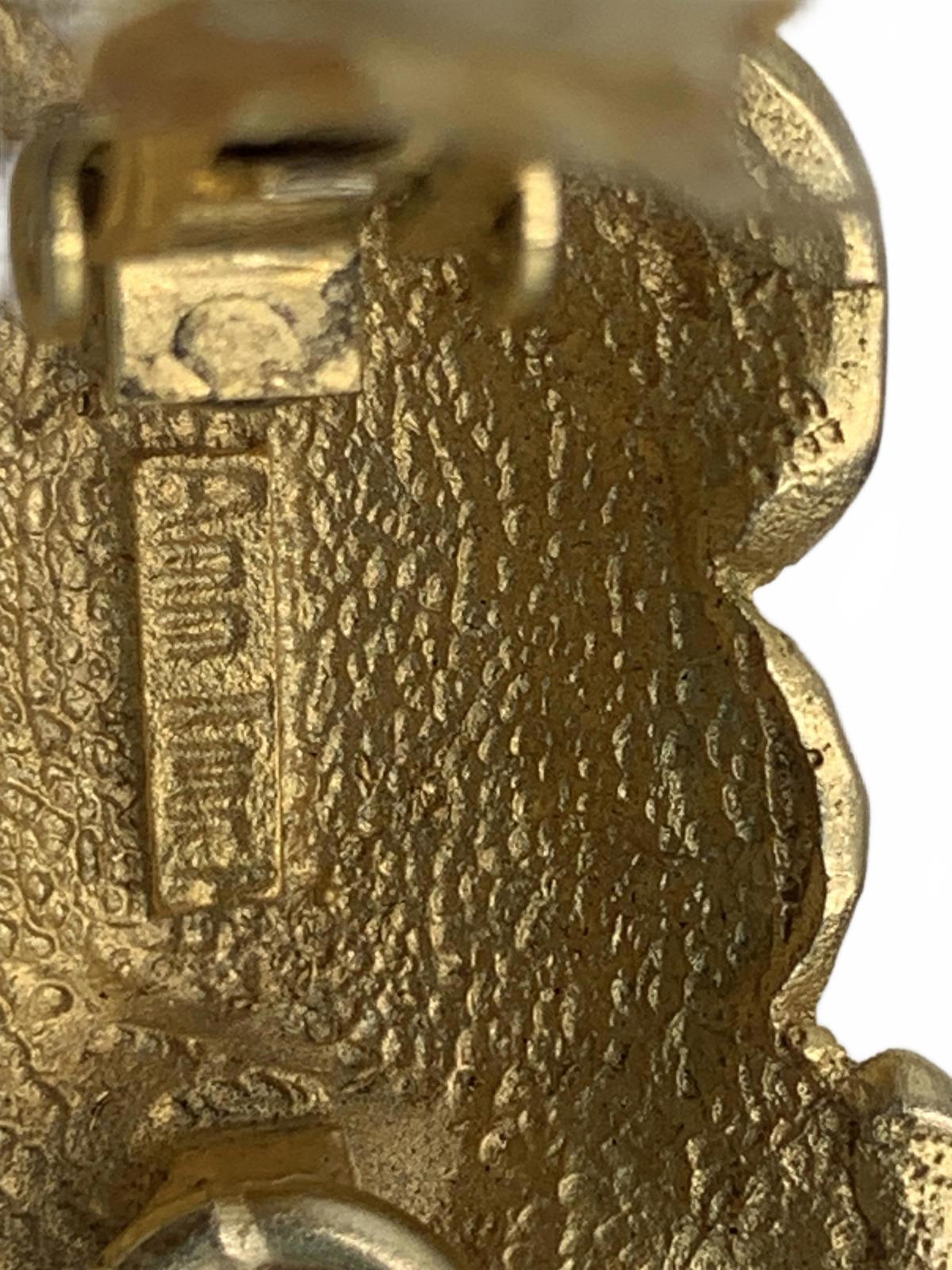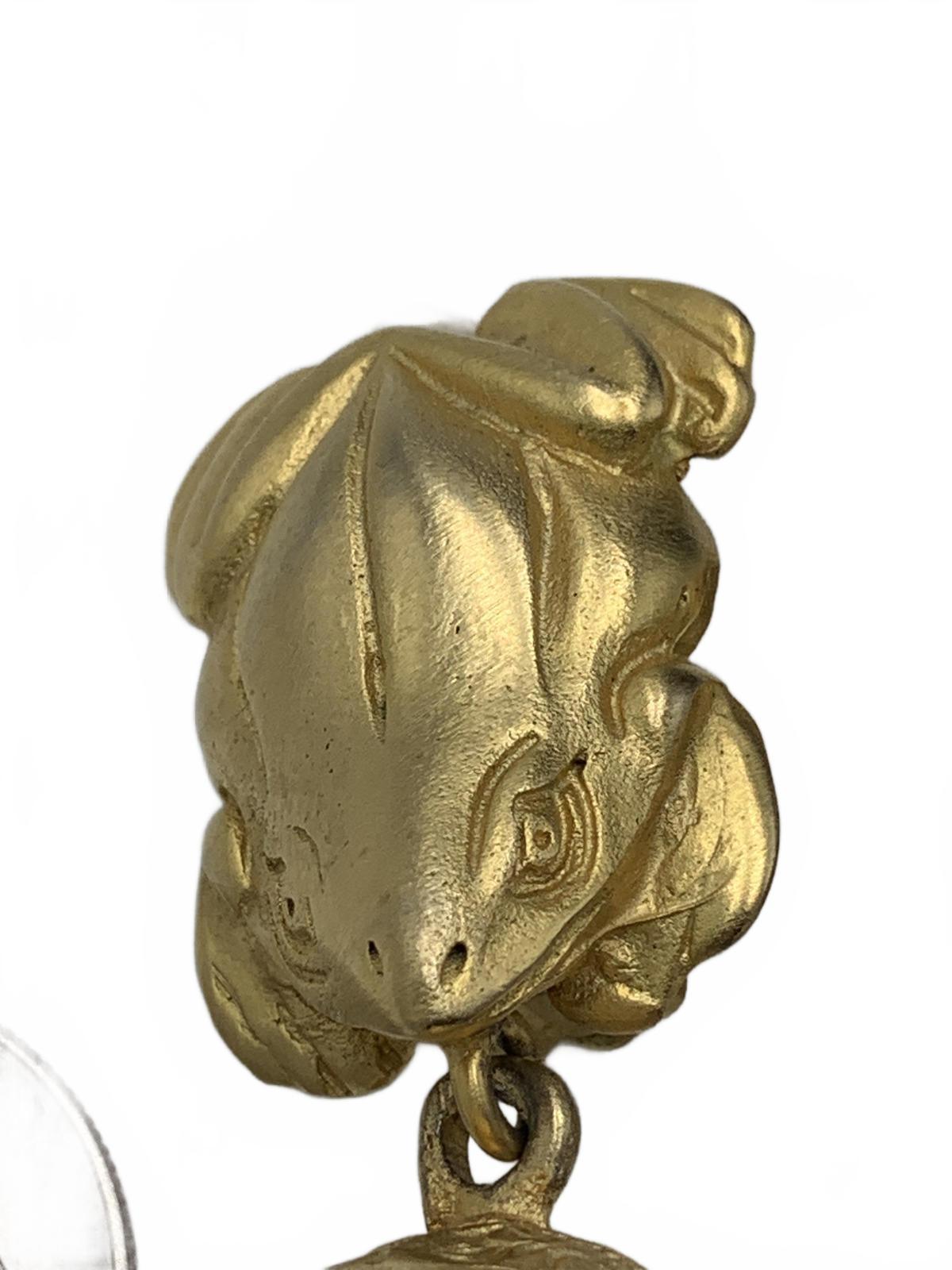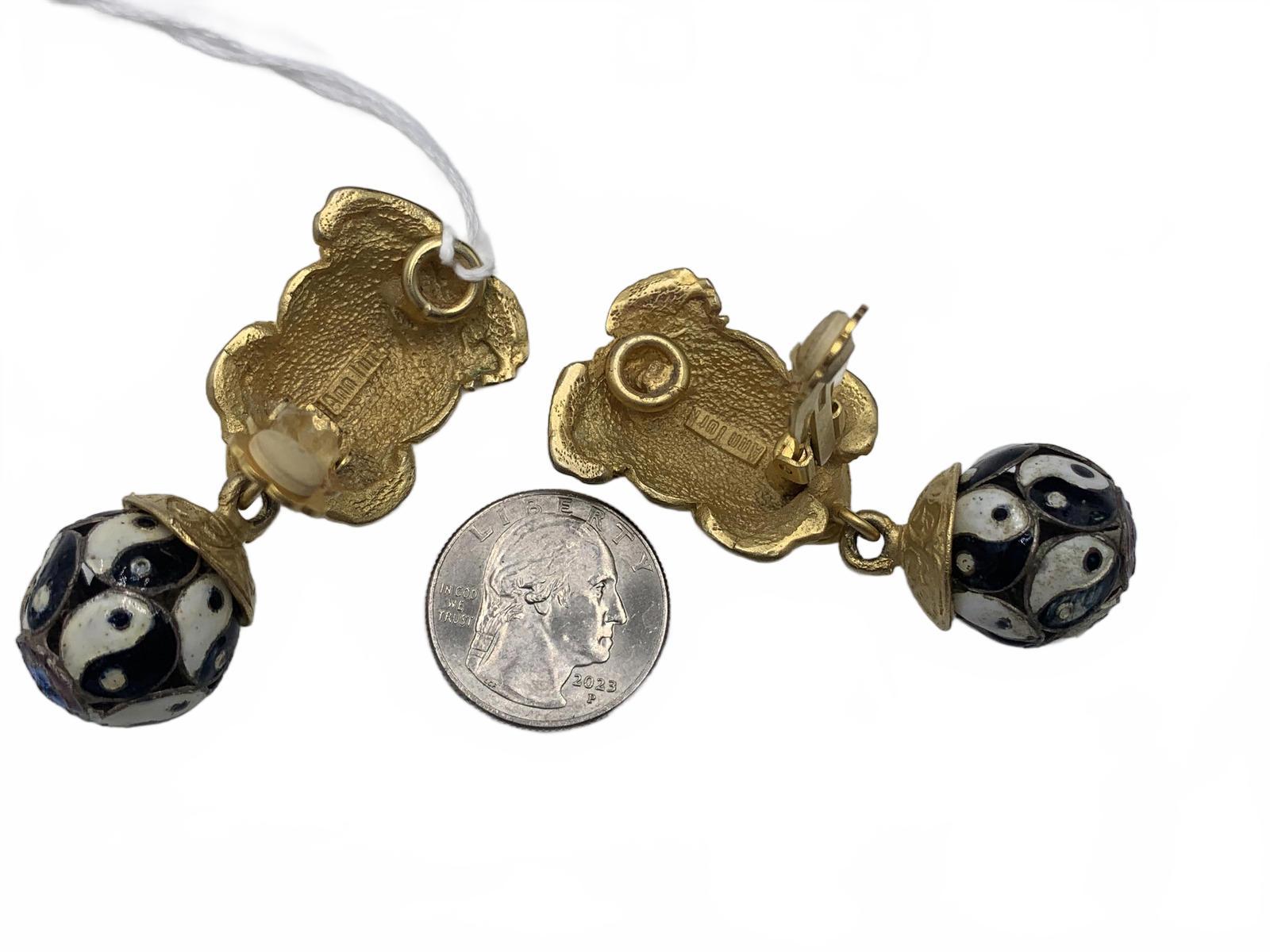 Rare Glen Miller for Anne Turk Jewelry: matte gold plated frog clip-on earrings with black and white dangling cloisonné beads in a Yin-Yang motif. Signed Ann Turk on the inside, likely by Glenn Miller.