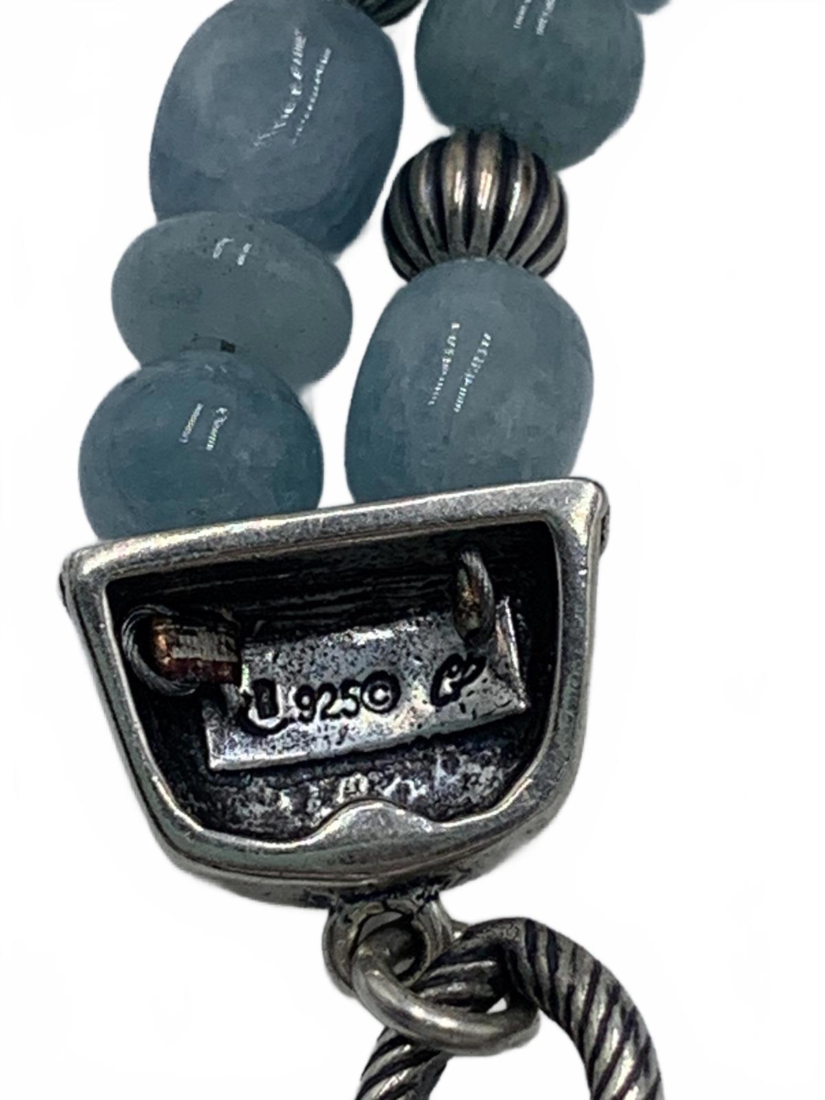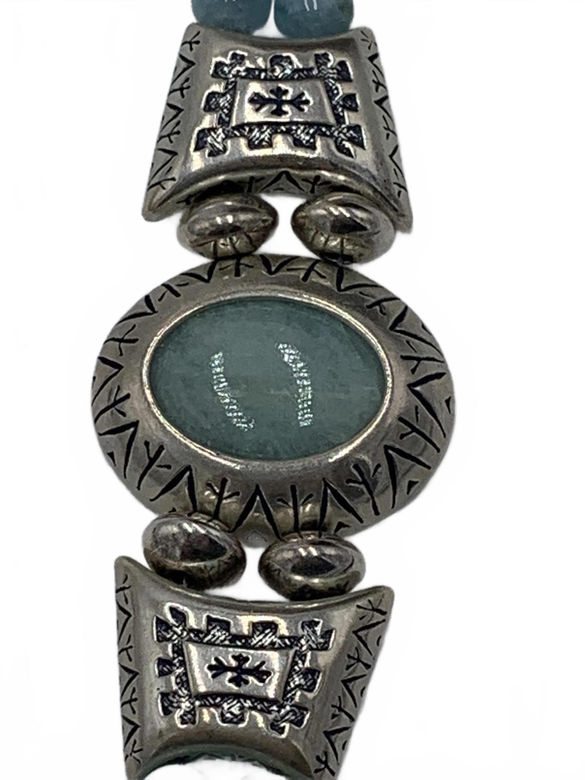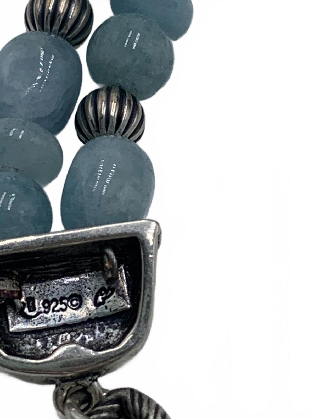 An exquisite example of Southwestern-inspired work by Carolyn Pollack. Marked throughout as 925 Sterling Silver on the castings, with Aquamarine beadwork and Cabuchons. Note the "CP" (Carolyn Pollack) signature device at the end of the bracelet. Adjustable from size 6.5-7.5" via a toggle clasp.