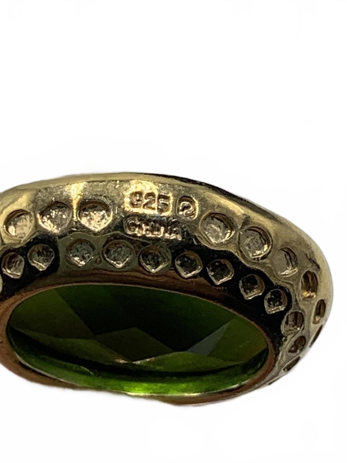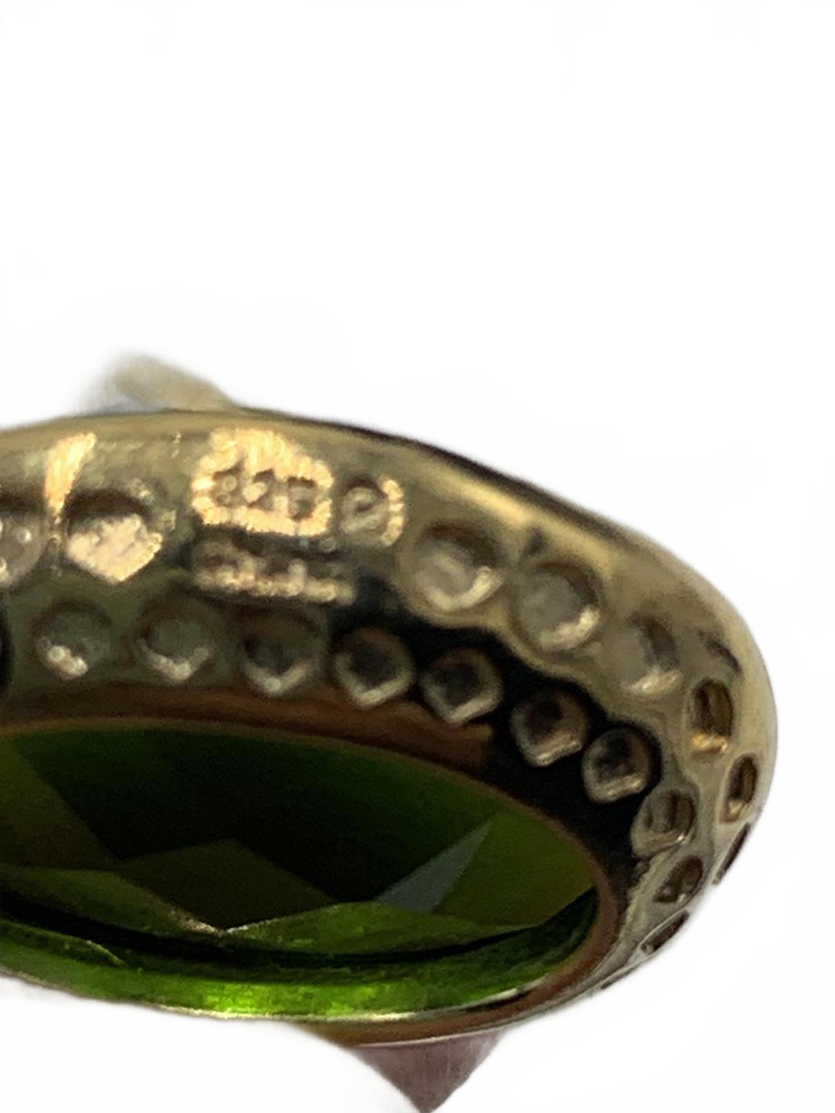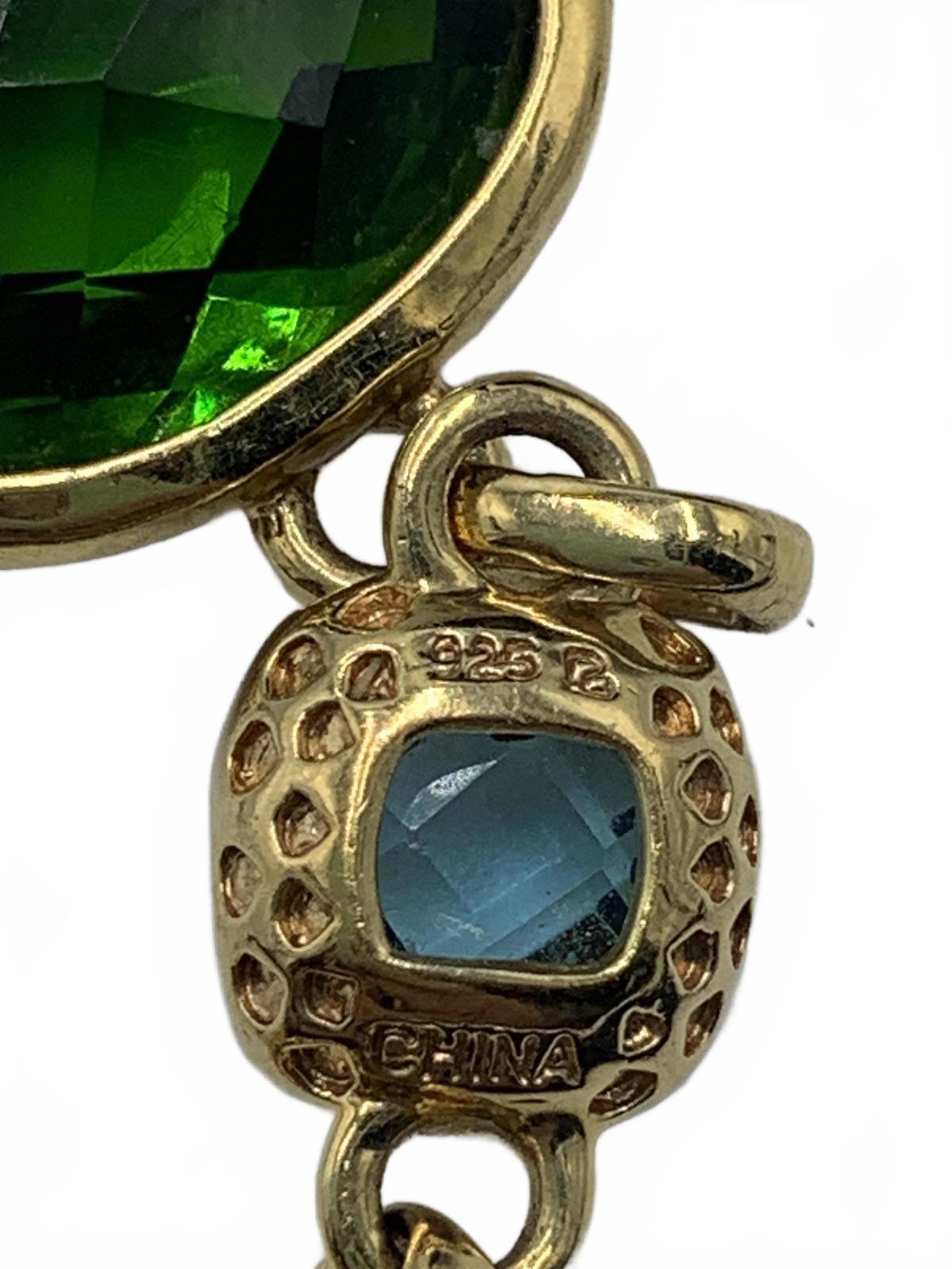 This exquisite, vintage gold-plated Sterling Silver bracelet & earring matched set with station-set gems in blue cushions and green cabuchons by Ross Simons is absolutely stunning. Cubic Zirconia is most likely, though we suspect Emerald or Garnet & Topaz are good possibilities as well.