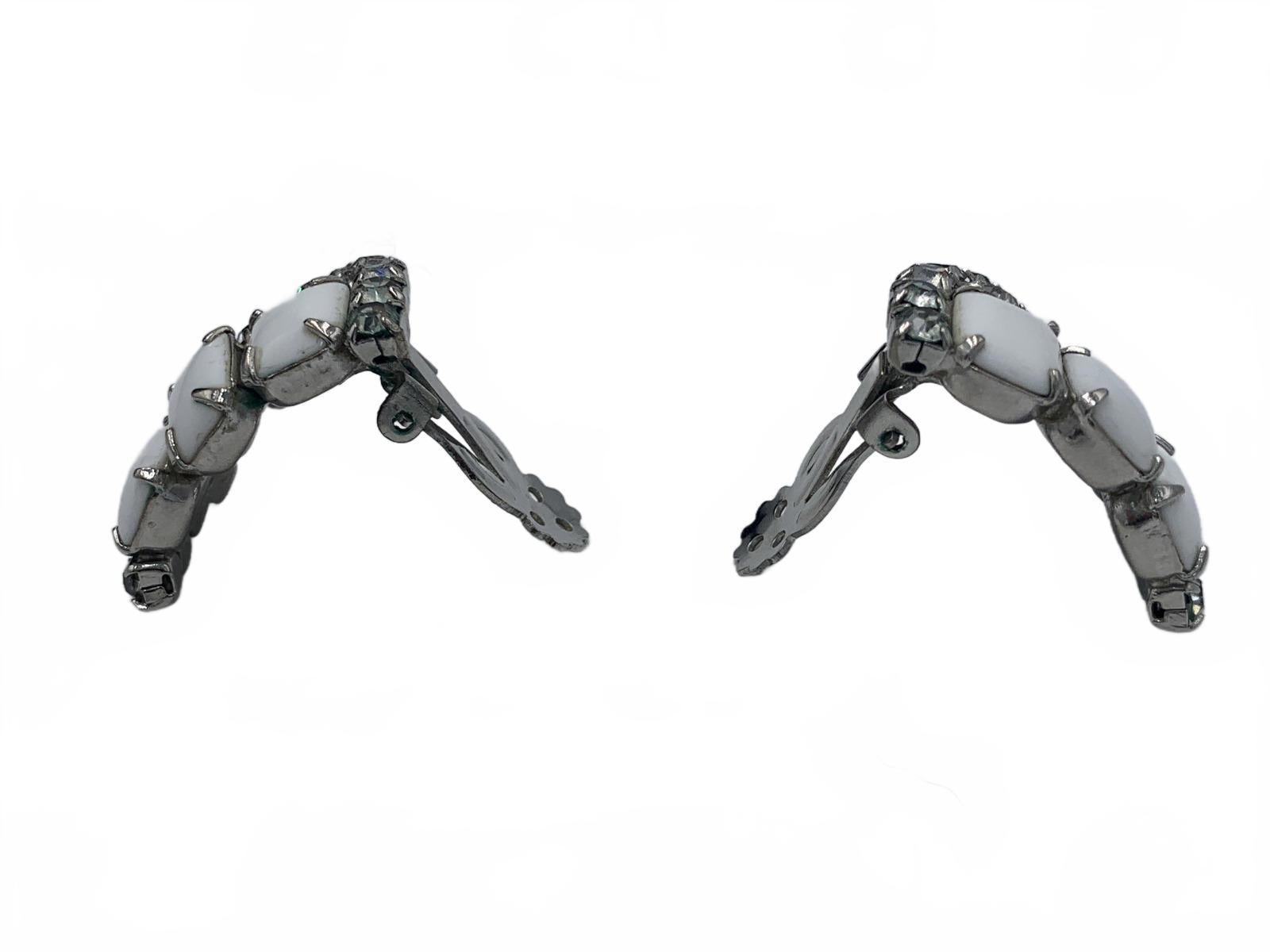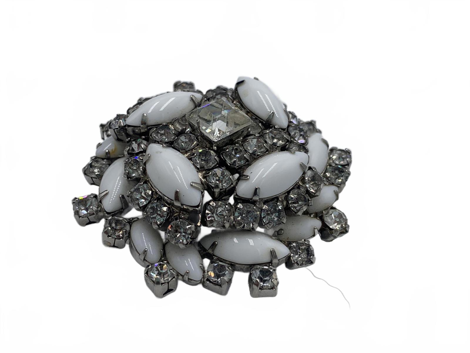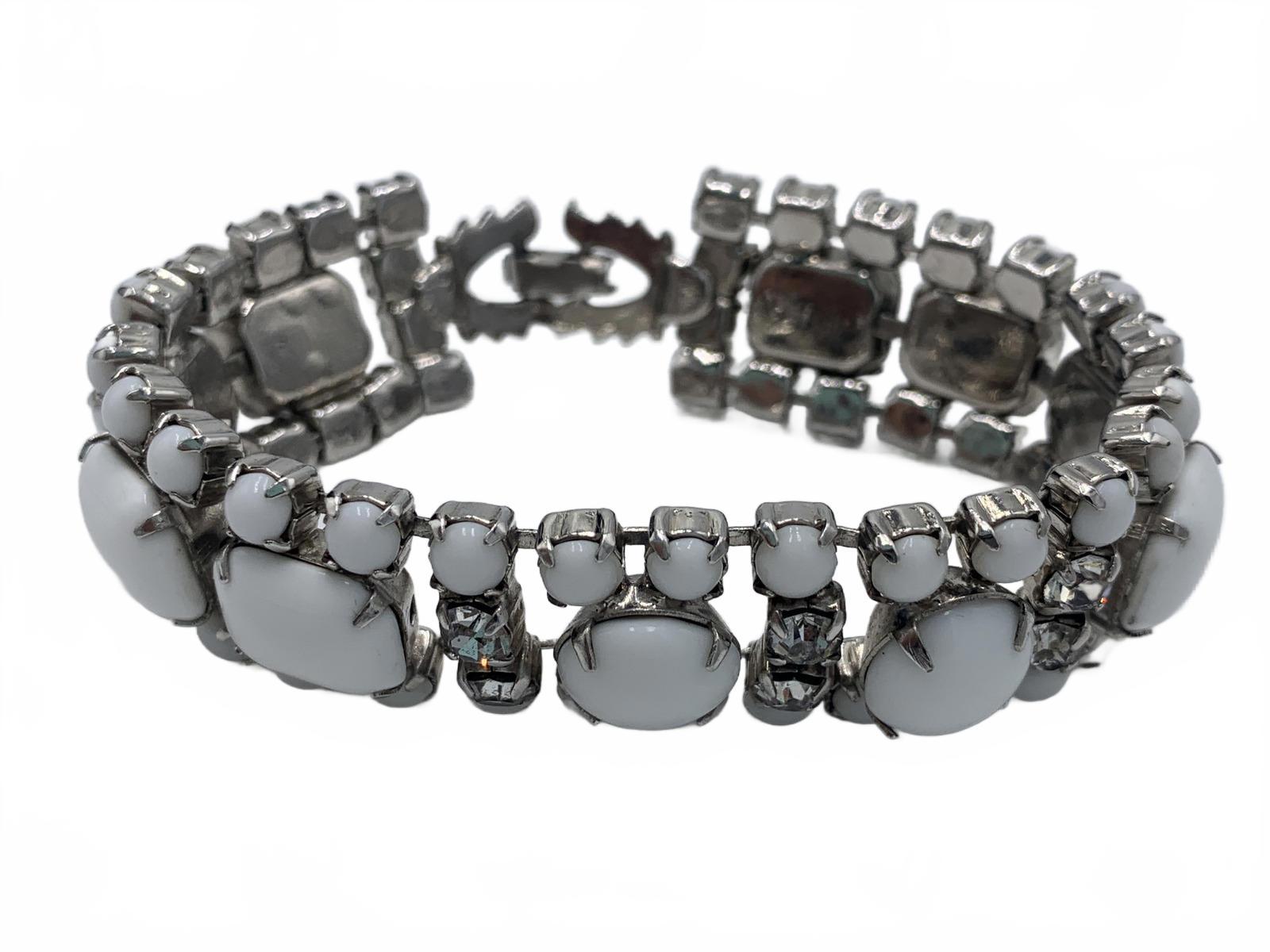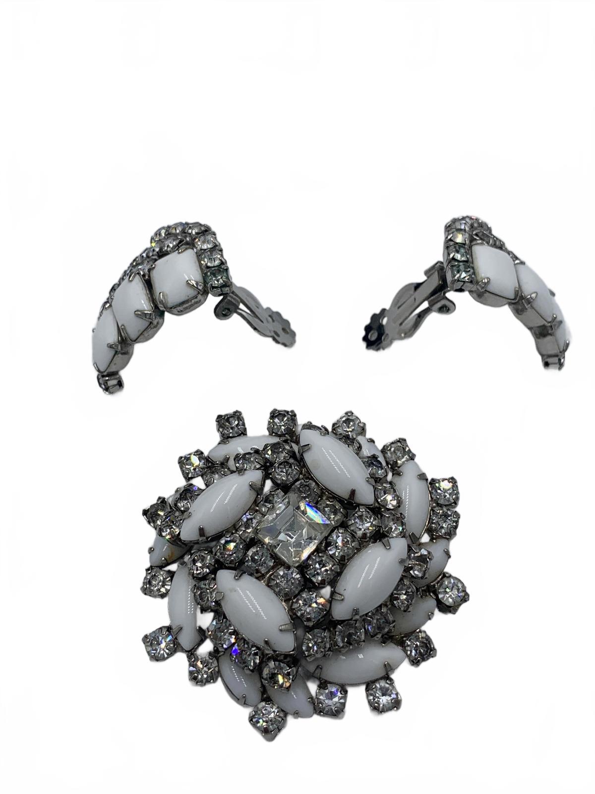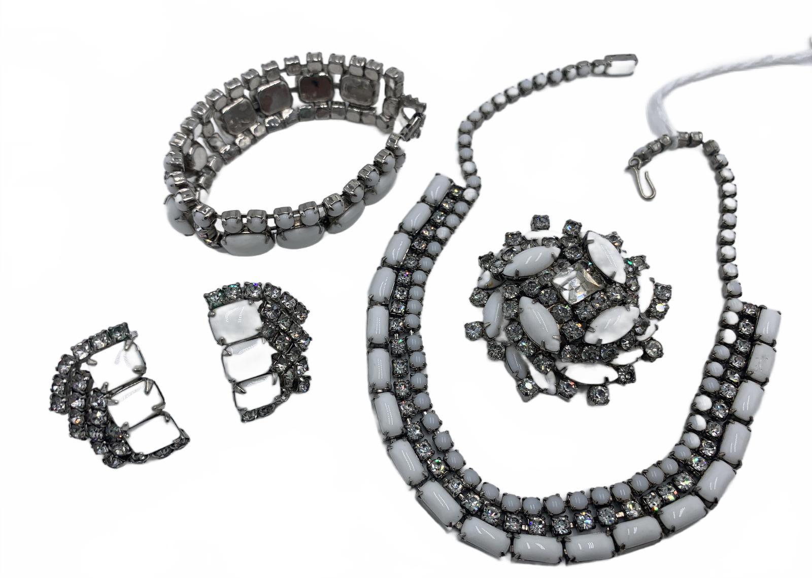 This beautiful white milk glass & white rhinestone set is a stunning and complete set to complement an over-the-top ensemble or formal occasion. Includes matching bracelet, clip-on earrings, brooch & necklace.
