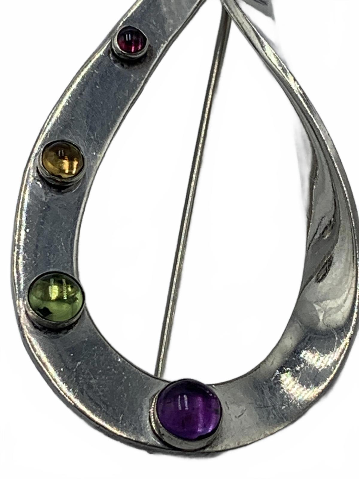 Lovely vintage abstract teardrop brooch in Sterling Silver, set with Peridot, Amethyst, Citrine & Garnet Cabuchons.