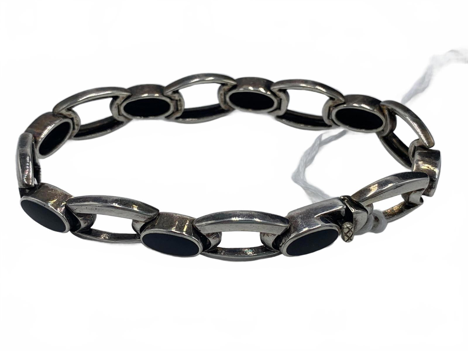 Striking Bracelet in Sterling Silver featuring open links, each inlaid with a Black Onyx oval. A sturdy, hidden clasp keeps this beauty punching above its weight in quality and finish.