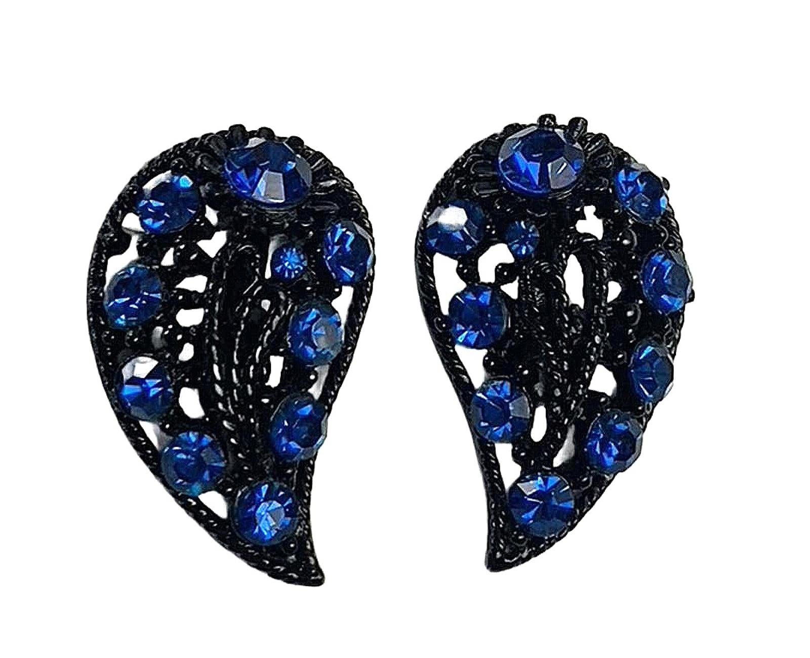 Unsigned Japanned Blue Rhinestone Abstract Leaf Clip-On Costume Brooch size 2.5""