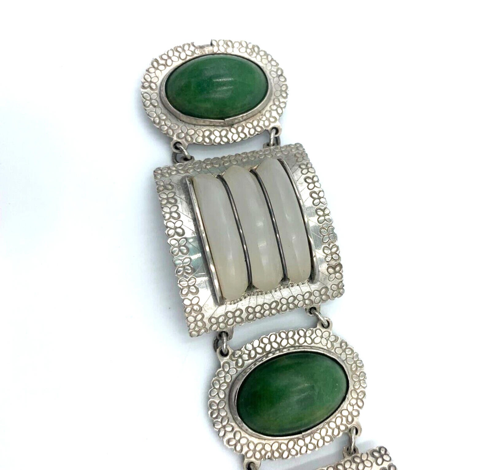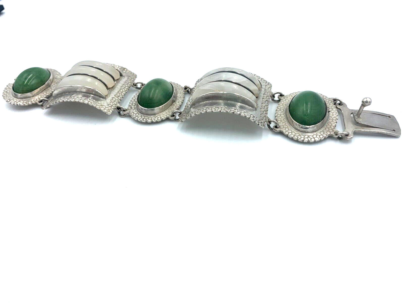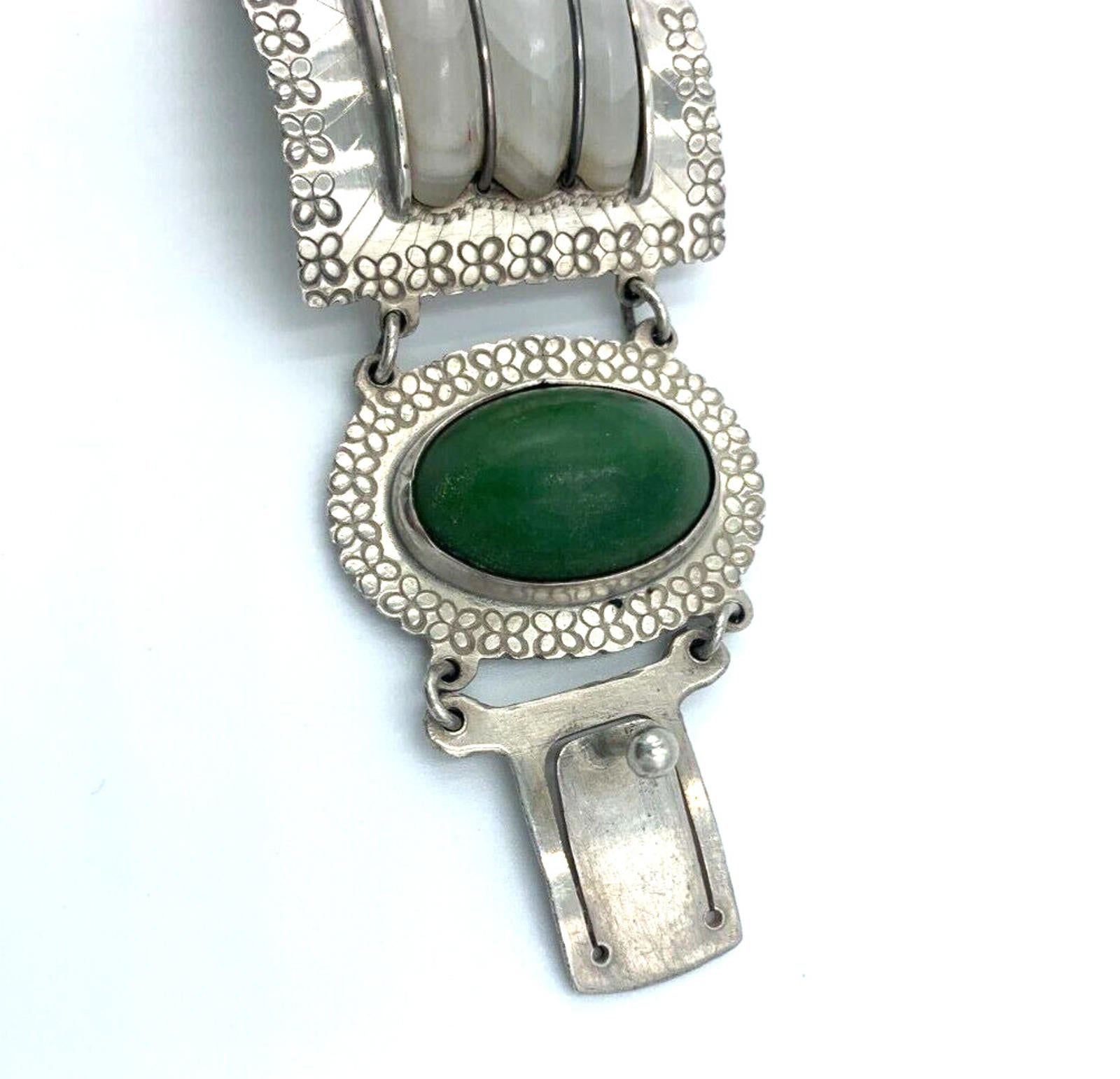 Vintage Artisan Handcrafted Sterling Silver Quartz Nephrite Wide Bracelet Mexico