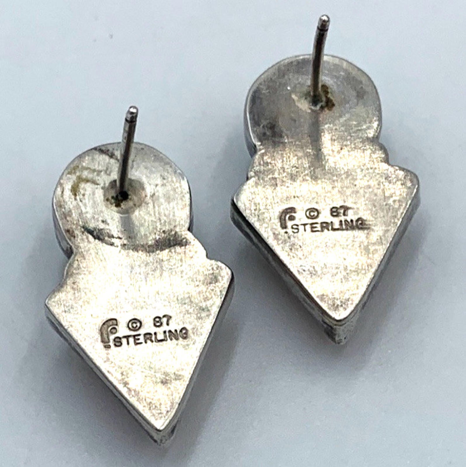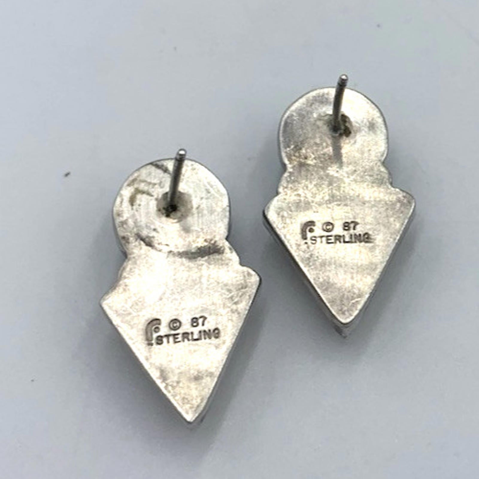 These vintage earrings by Carol Felley feature a Southwestern style with green aventurine and rose quartz stones. The studs are made of 925 silver and are signed by the designer. Sold with patina.